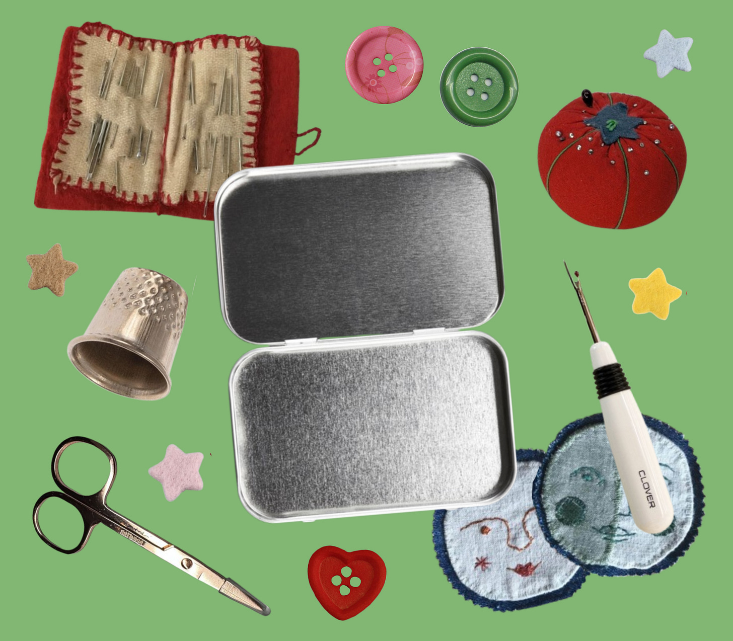 ☐ sewing kit: thimble, scissors, needles, buttons, fabric, safety pins, thread, seam ripper