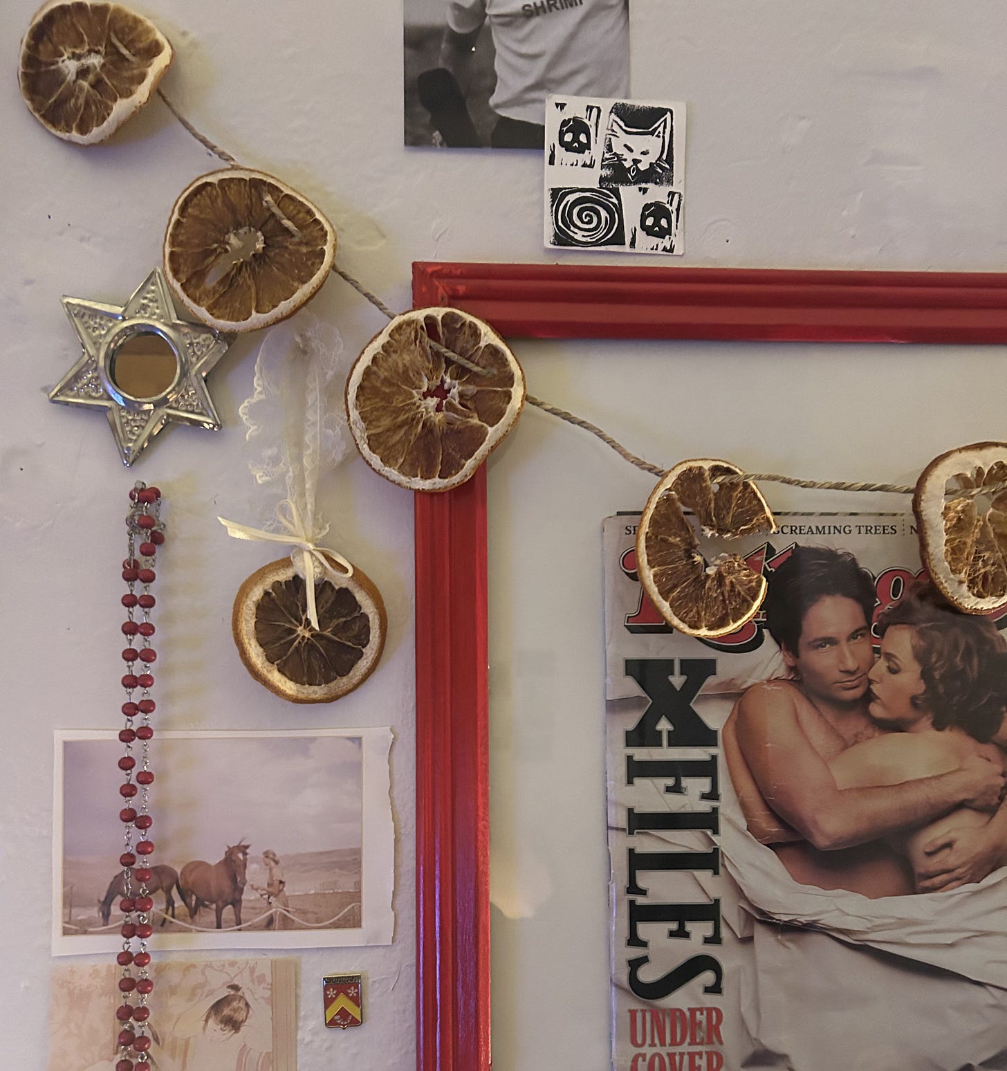 One way that I like to spend my time in the winter is making things for the people I care about. I love putting together homemade garlands. The origin of drying oranges and hanging them as garlands in the winter is contested—one poem from 1823 indicates that people were putting oranges in their stockings as a reference to St. Nicholas’ “miracle of the dowries,” in which he blessed families by tossing gold balls into their homes. Oranges, resembling gold balls, may be a way to invite wealth into one’s home, but oranges themselves were also luxury items in many parts of Europe. I love gifting chocolate oranges or orange garlands to my friends. In the winter, I hang my own orange garland in my room as a way to invite warmth into my home.