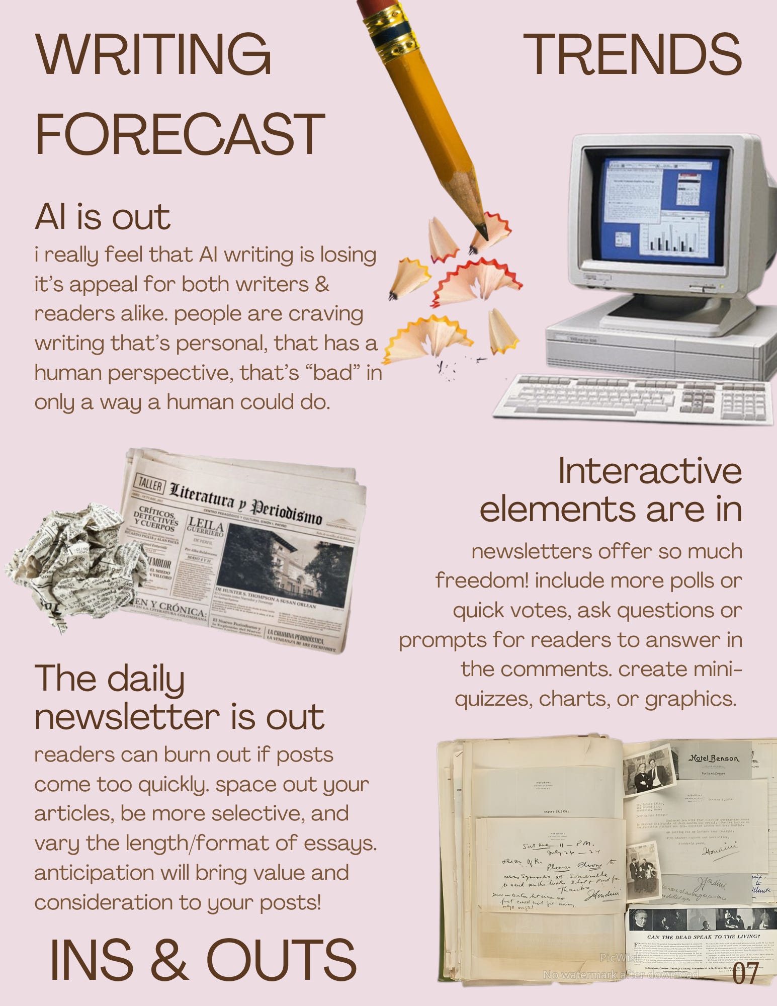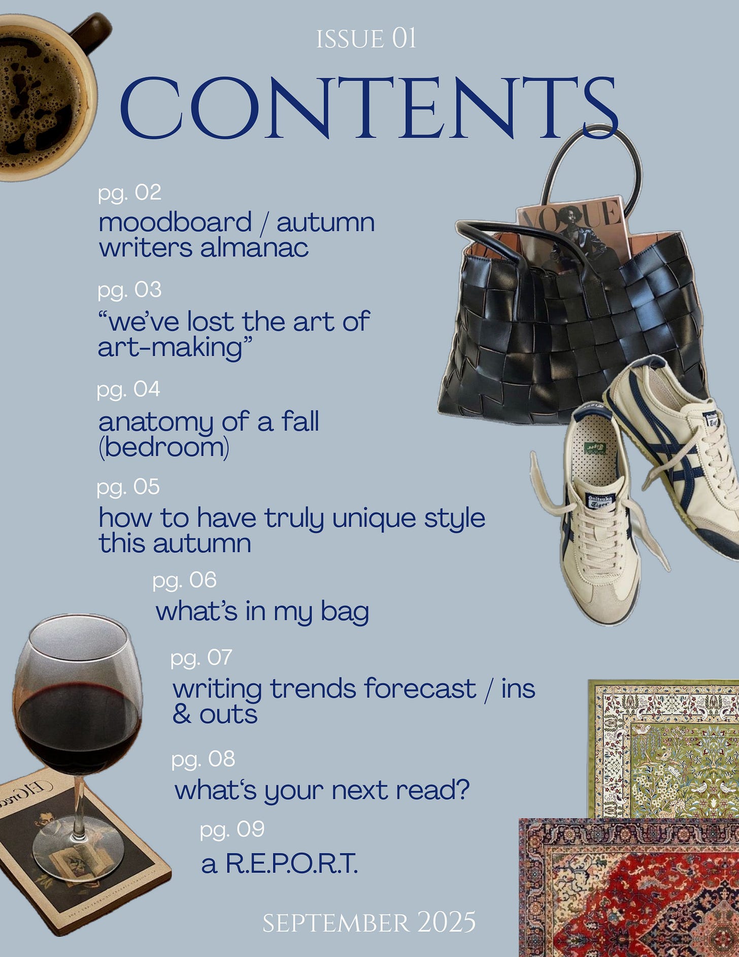 Welcome to the first issue of my digital magazine, Field Report. Inside you’ll find a mix of culture, mini-essays, fashion, writing advice, and so much more. Think of it as part zine, part notebook, part almanac—the kinds of things I usually explore in my newsletter, but collected in a new, fun format.